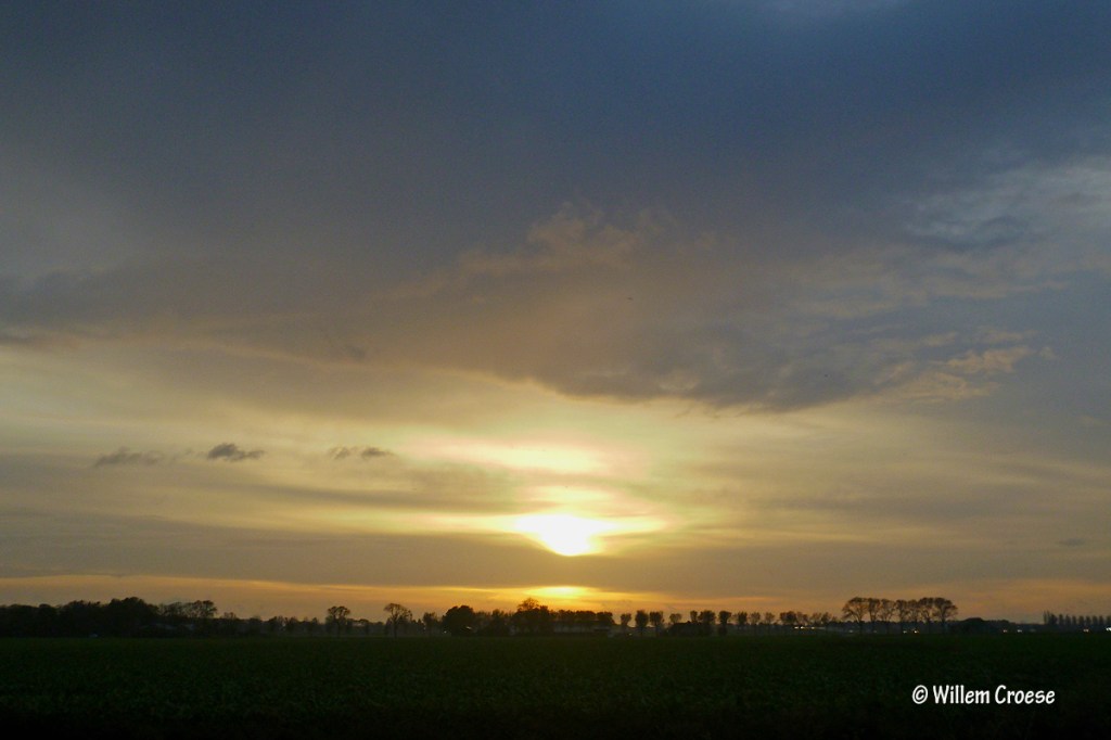 Tijdens het ochtendkrieken komt de zon op tussen de donkere wolken …