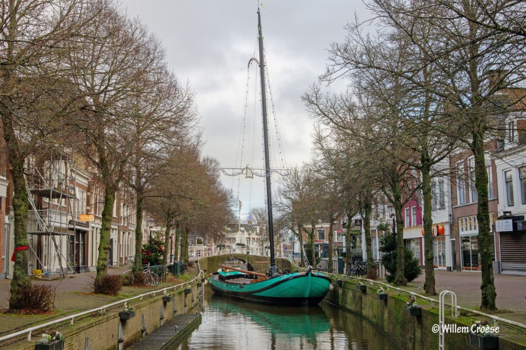 Dan sta je op een brug in het centrum van Harlingen. En daar ligt een groen schip die geen kant op kan, dus dan maar dwars …