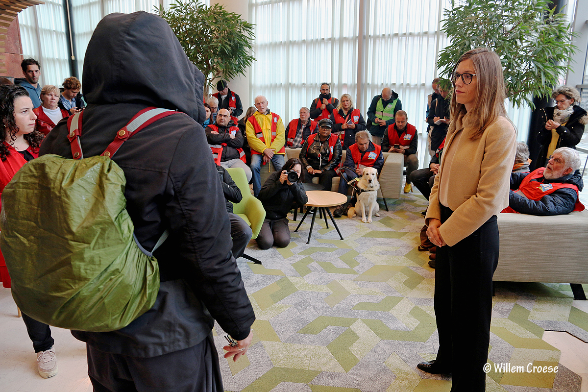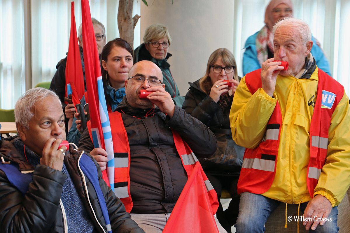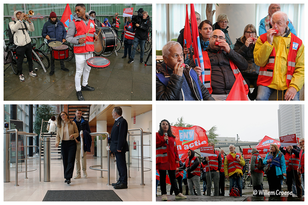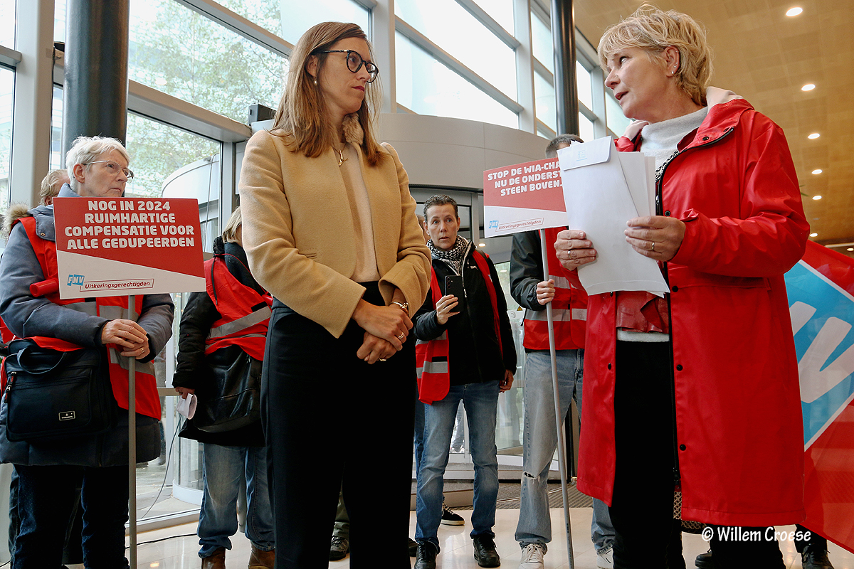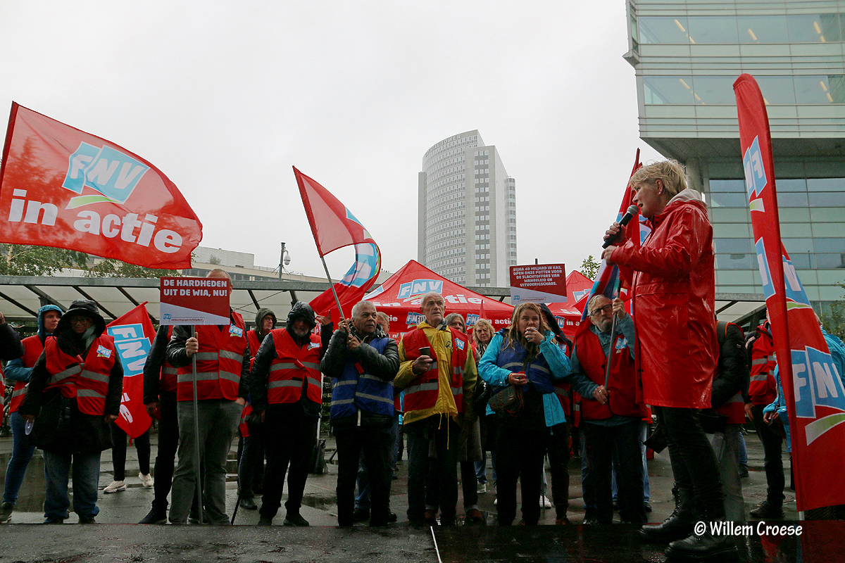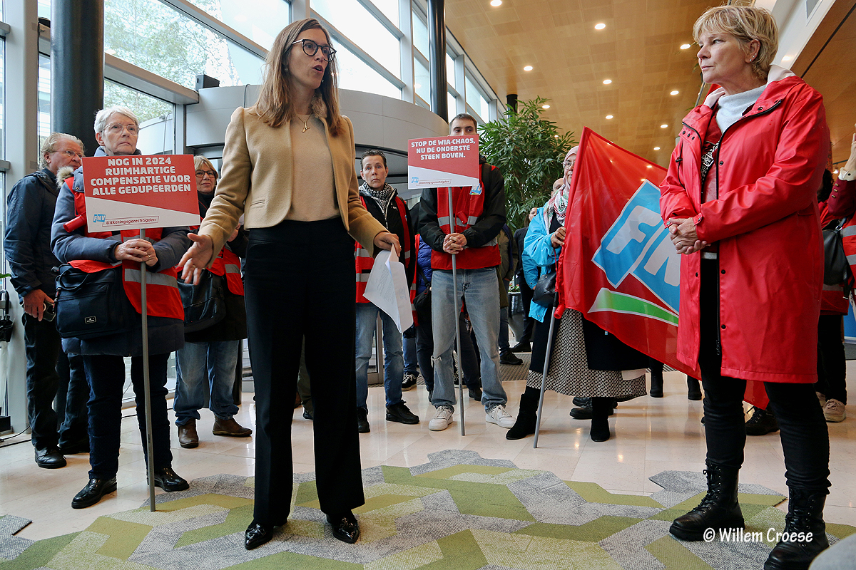 Amsterdam – FNV-Uitkeringsgerechtigden waren vandaag in actie bij het UWV-hoofdkantoor over de Wia-chaos die de uitkeringsinstantie kent. Ondanks lawaai van de actievoerders kwam er geen reactie van het UWV-bestuur, maar wel nadat de vakbondslieden de hal in het gebouw bezetten. UWV-bestuurder Johanna Hirscher luisterde niet alleen naar FNV vice-voorzitter Kitty Jong maar ook naar slachtoffers van de Wia-chaos. Volgens haar zijn de verhalen pijnlijk en daarom moet het probleem echt goed opgelost worden.