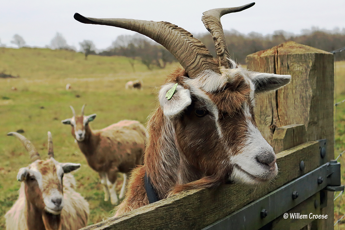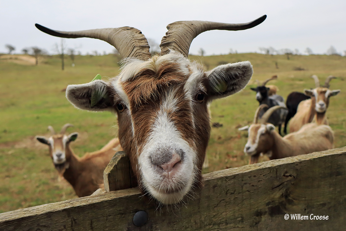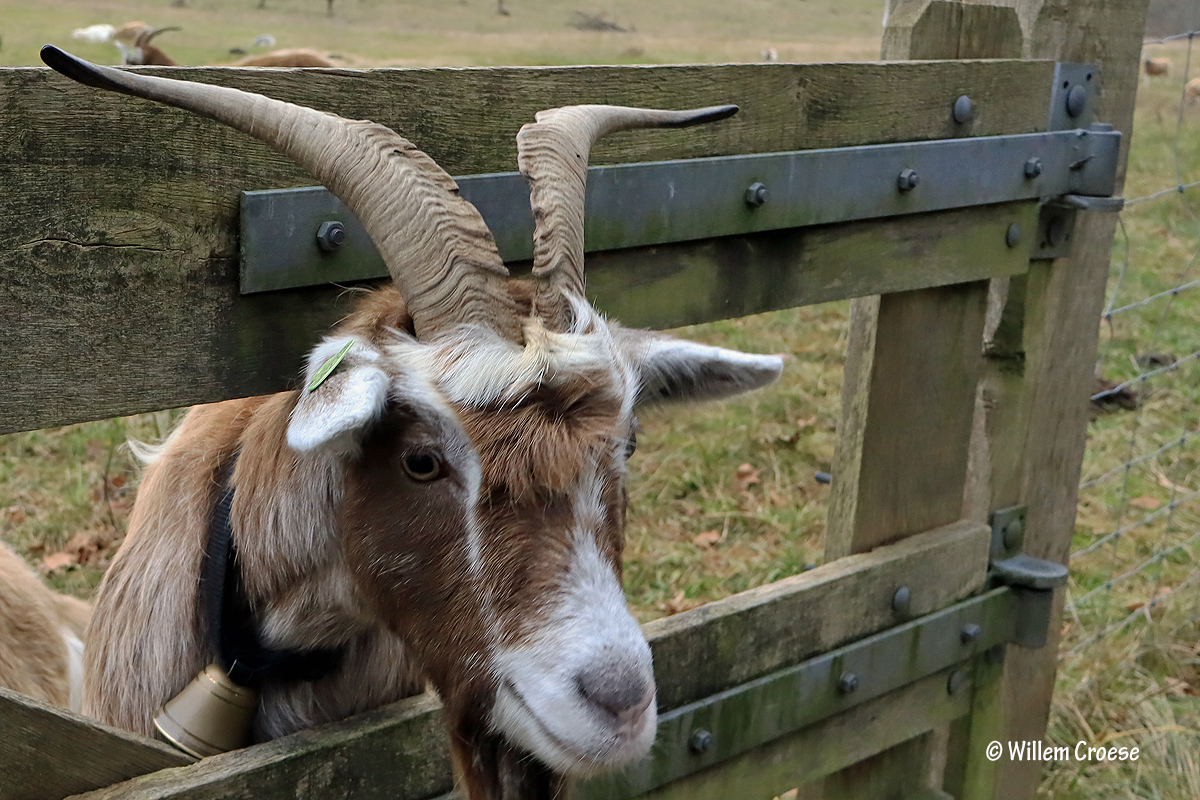 NH Duinreservaat – Heemskerk – In een met hekken omringd stuk binnenduin lopen vaak geiten en schapen. Vandaag waren alleen geiten zichtbaar. Zeer goed zelfs. De leider van de kudde kwam ongevraagd naar het hek. Luid en duidelijk maakte deze bok zijn aanwezigheid kenbaar met de bel die om zijn nek hangt.