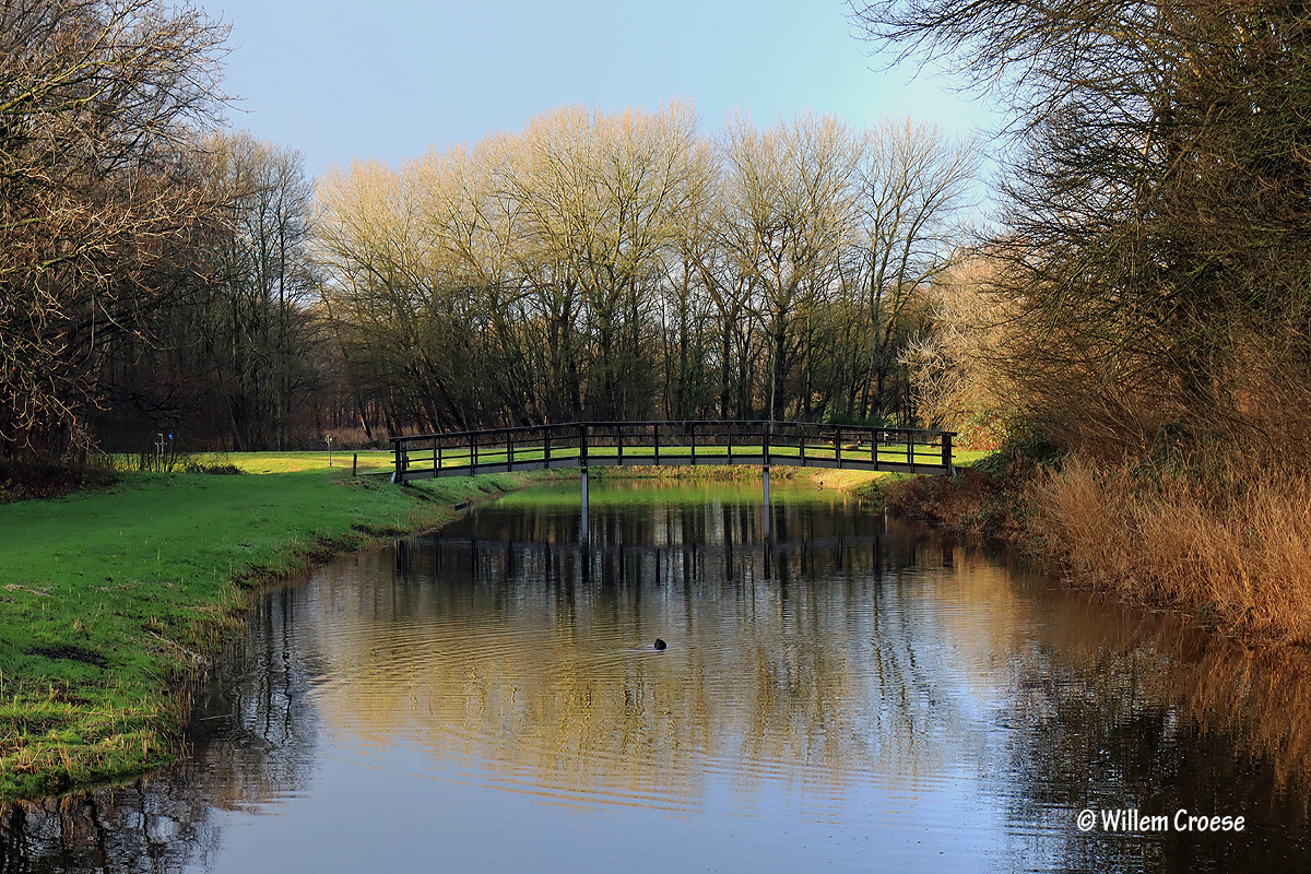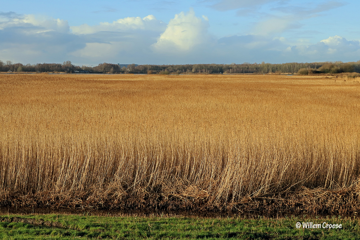 Het Twiske – Uitlaatronde met viervoeter Benthe. Het licht was apart eigenlijk typisch winter. Met vergeeld riet, zonnestralen op bomen, strakblauwe lucht die weerspiegelt in het water, enzovoorts. En ook nog een omgewaaide boom.