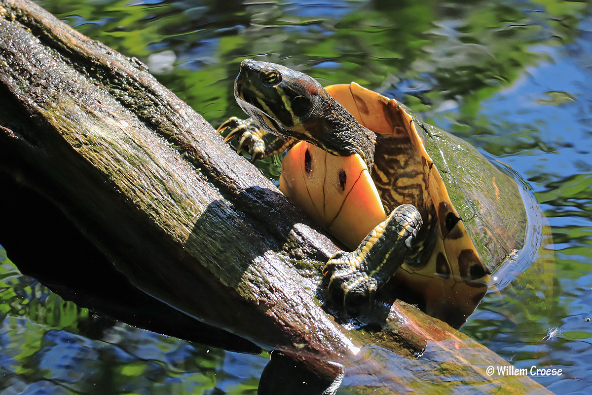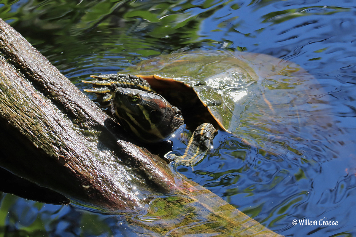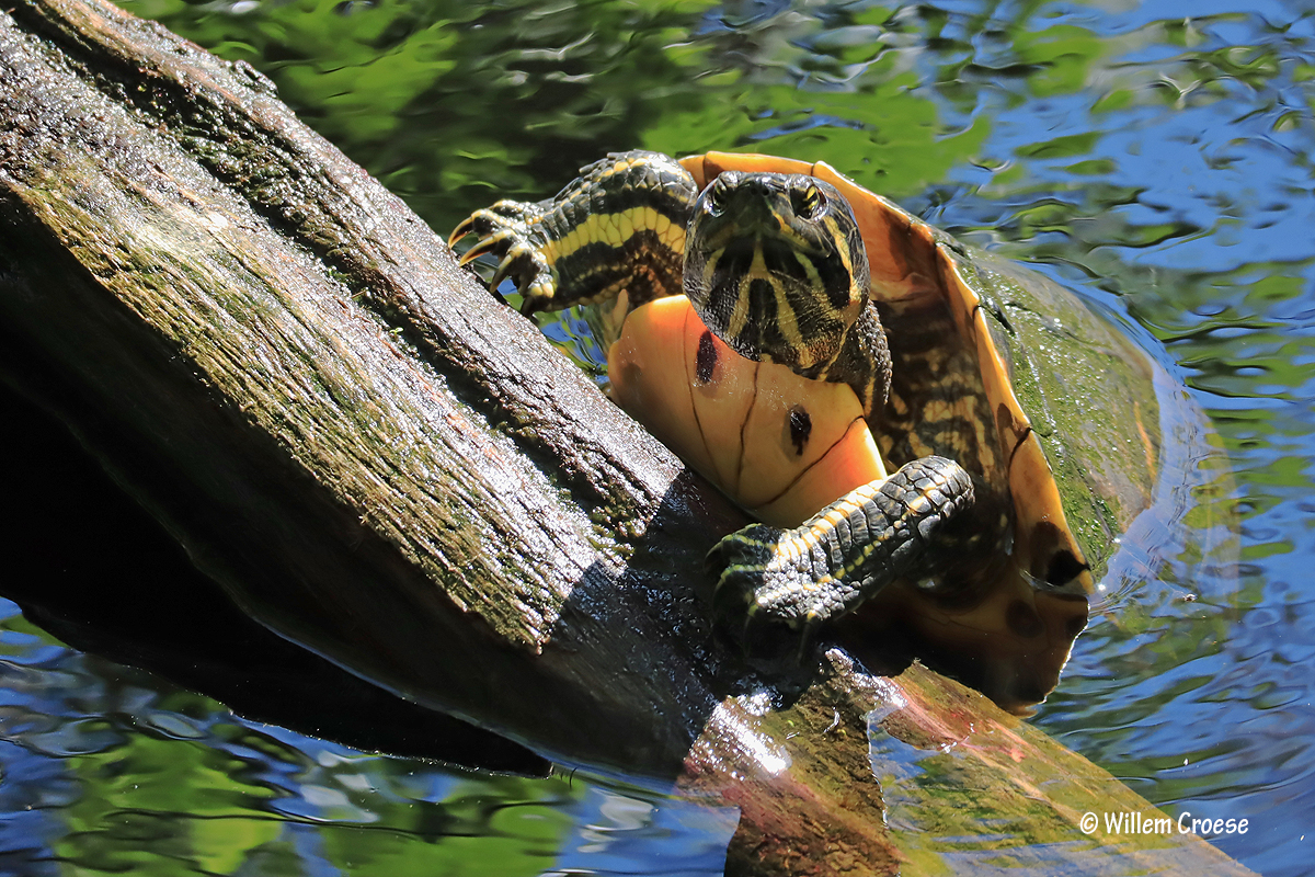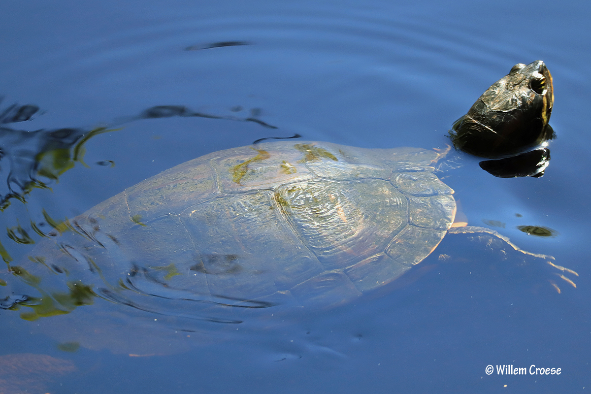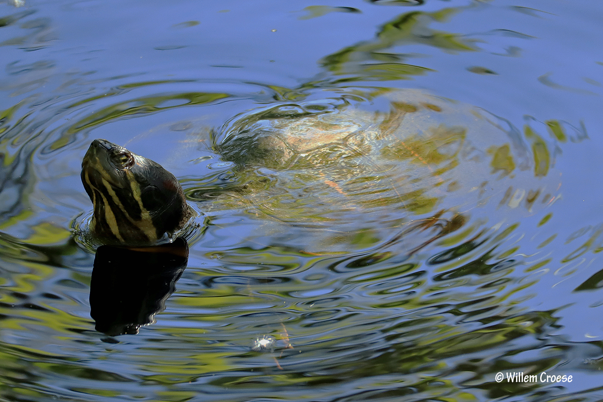 Den Helder – Tijdens een wandeling door de Grafelijkheidsduinen vond er in het water iets bijzonders plaats. Twee eenden jaagden een ´schildpad´ op. Ja beste lezer het is echt waar. De schildpad zwom uiteindelijk naar een tak waarop deze klom. Niet veel later vertrok de schildpad door alsnog weg te zwemmen. Al met al een bijzondere ontmoeting die je niet direct verwacht. Kijk hieronder verder: