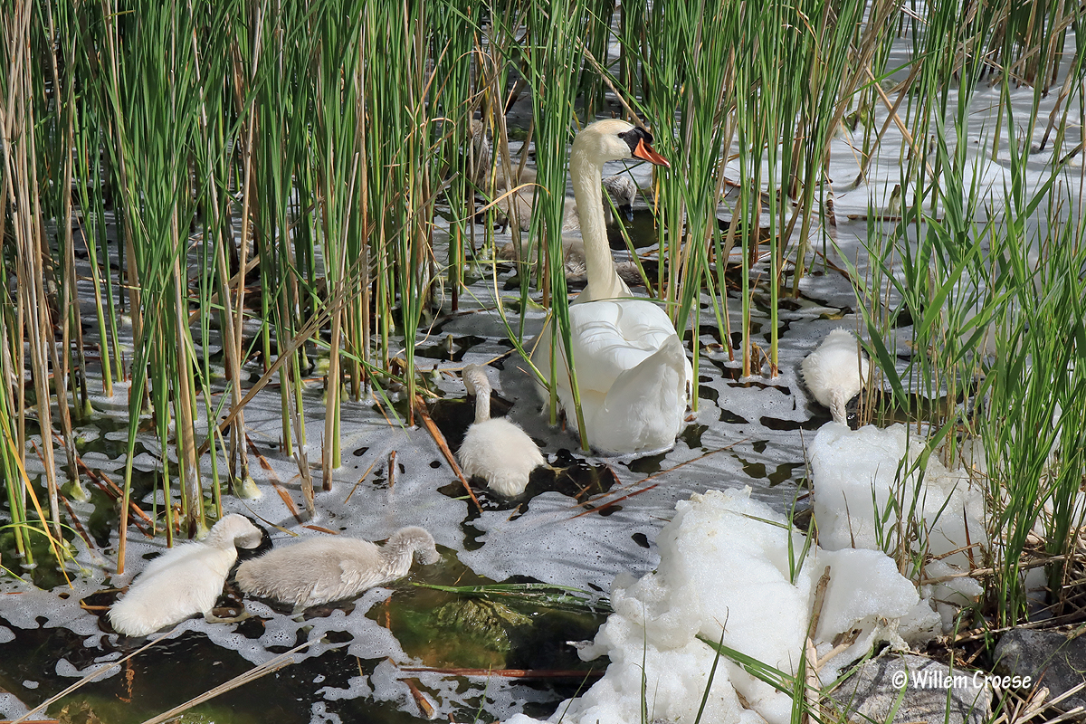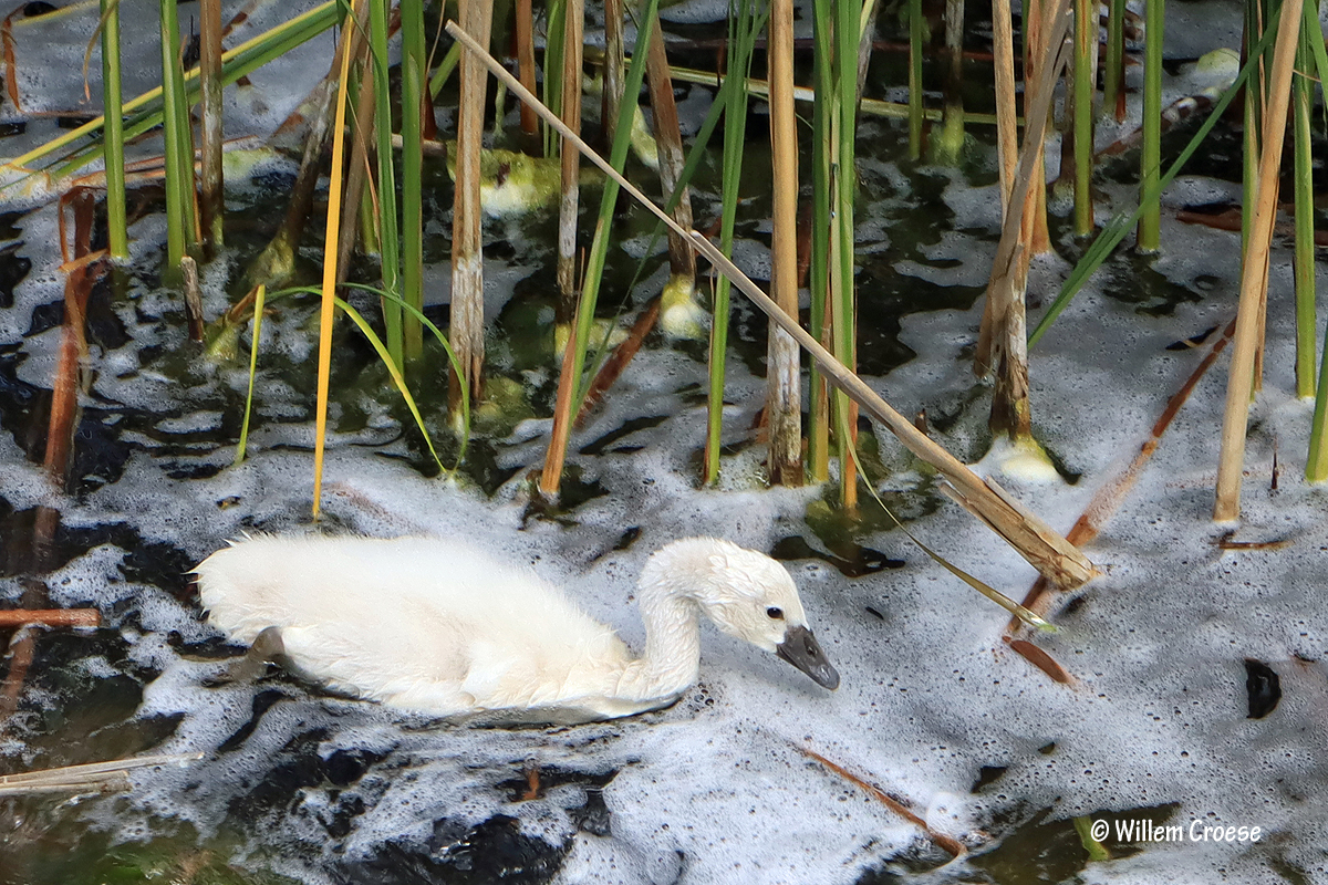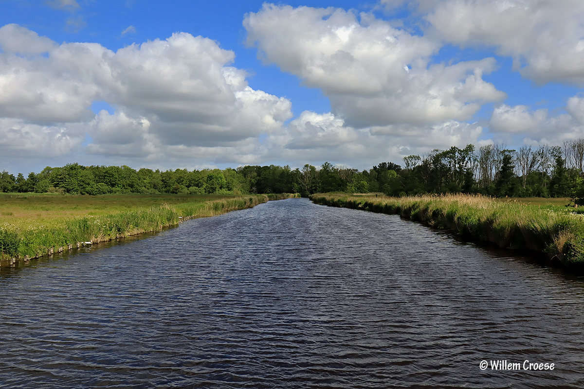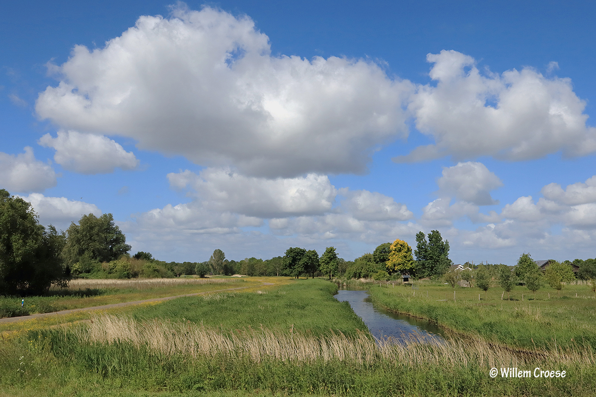 Het Twiske – Het was zo´n dag dat wolken in verschillende tinten massaal boven het landschap het beeld bepaalden. Donker en licht aangevuld met af en toe zonneschijn maar ook zelfs met lichte regenbuien. Er waren eveneens momenten dat de wind stevig over het water raasde zodat aan wal veel schuim te zien was. Het ultieme van deze wandeling was de ontmoeting met een knobbelzwaan die maar liefst negen jonkies bij zich had. Al met al heerlijk uitgewaaid en genoten van de polder.