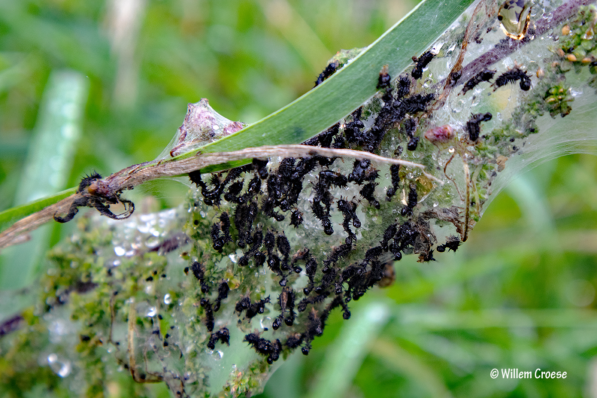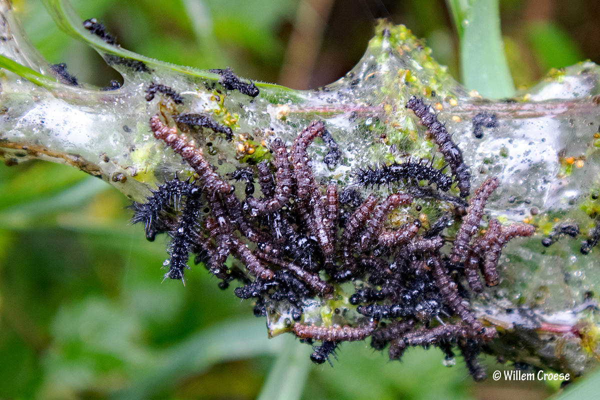 De ontdekking van een paar dagen geleden zijn Dagpauwoog rupsen. Intussen lijkt het er wel op dat zij zijn ontpopt. Maar op andere plekken zijn er meer, zie hieronder …