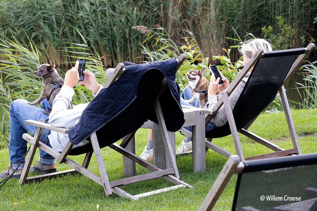 Op het terras van een horecazaak in het Twiske een ouder stel in klapstoelen. De man en vrouw hangen ieder onderuit met een hondje op schoot en jawel de smartphone in de handen. Terwijl zij turen naar de laatste berichten kijken de viervoetertjes verveeld naar de omgeving. Pfff ouwe knarren …