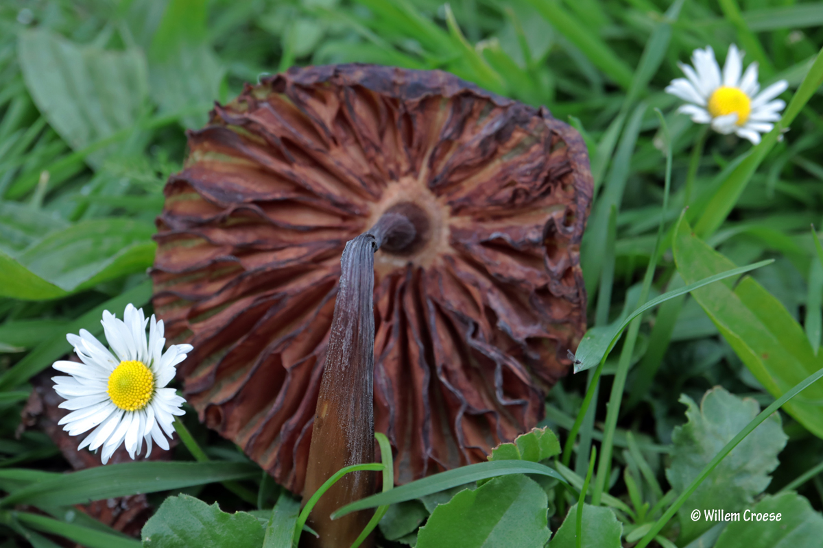Tja de tijd zit er op voor deze zwam en dan beland je ook nog eens in het groen en tussen twee bloemetjes …