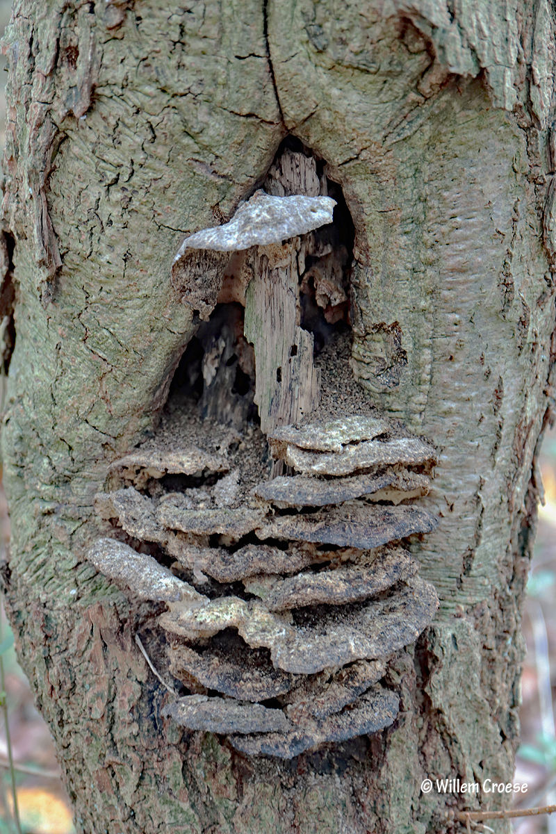 Mepperdennen – En dan loop je door het bos en staat daar een boom die een paddenstoel draagt als een eerbetoon in bijna dezelfde kleur. Wonderlijke ervaring. En geen idee welk soort dit is, maar bijzonder is het ‘paddomonument’ wel …