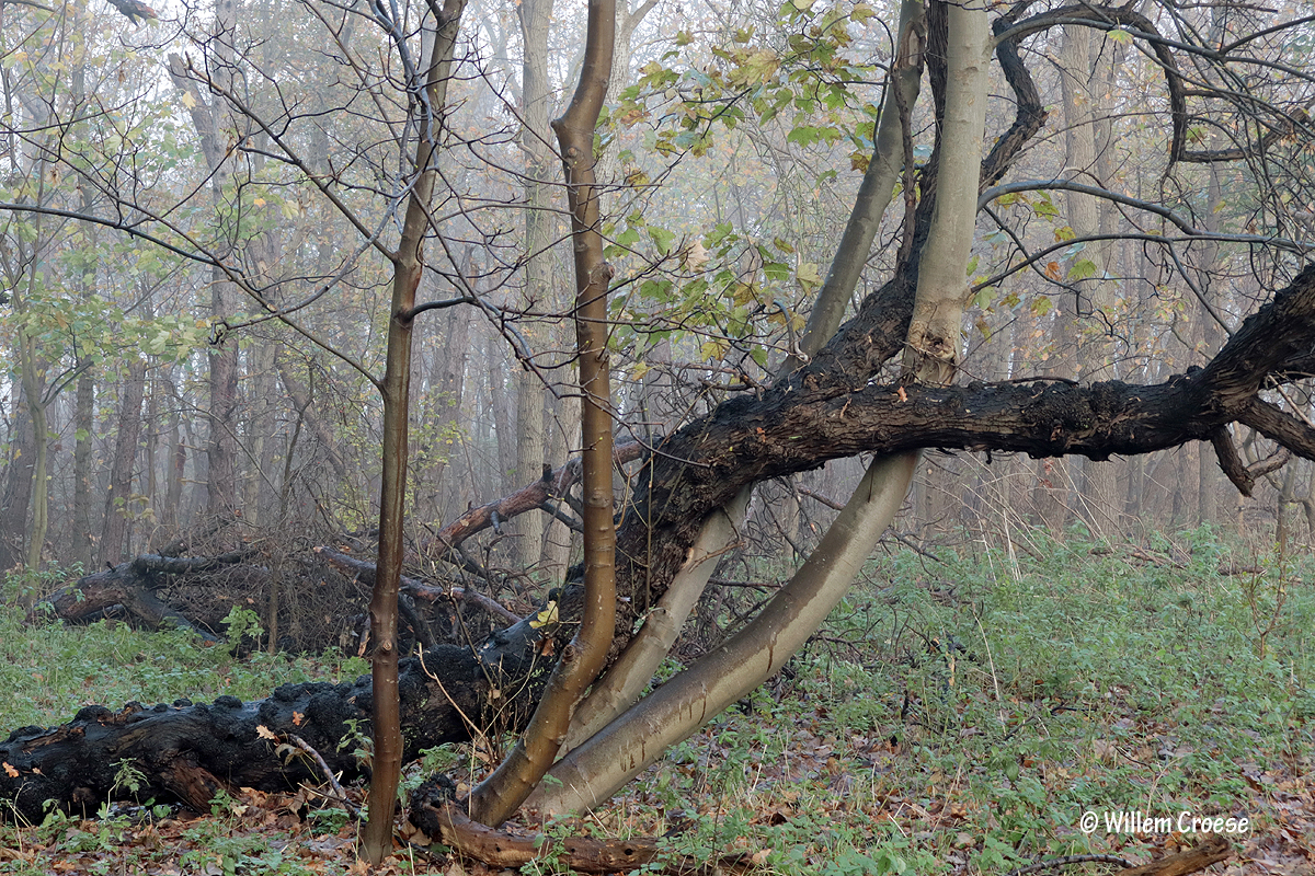 03. Een omgevallen boom wordt overeind gehouden door jonge bomen. Een waar kunstwerk …
