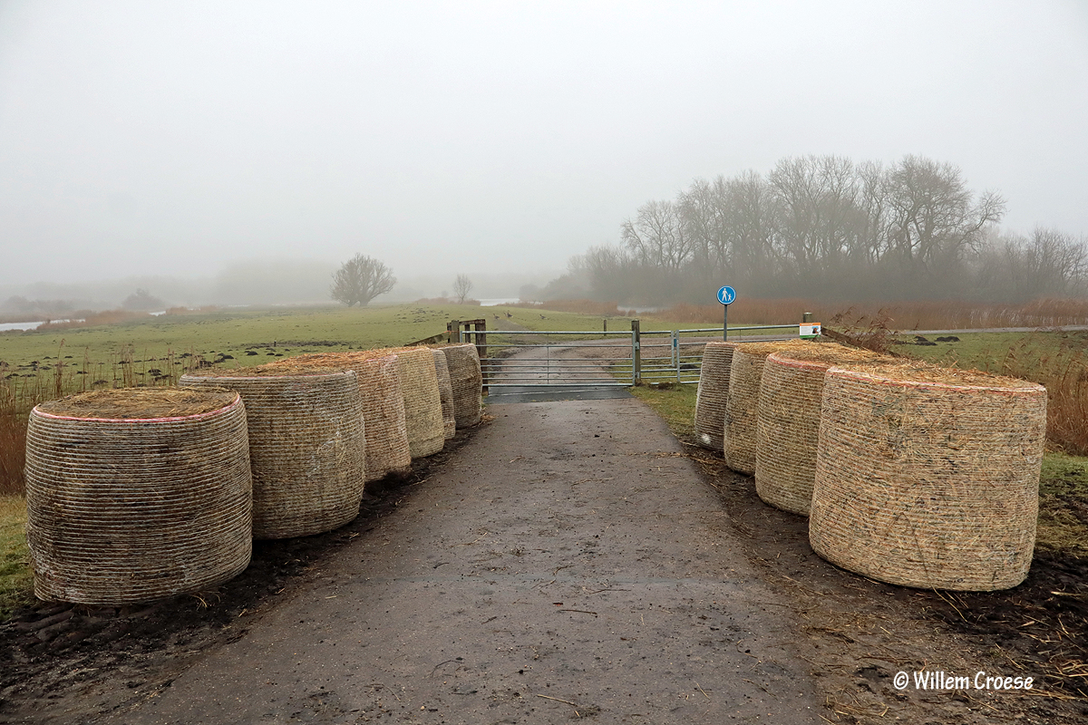 07. Voor het hek staan rollen hooi klaar zodat de koeien eventueel bijgevoerd kunnen worden …