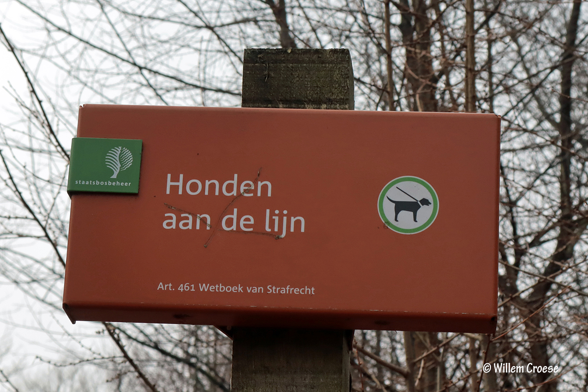De route was leuk. Met pijltjes op paaltjes werd het perfect aangegeven hoe wij moesten lopen. Onderweg zag ik al bordjes van Staatsbosbeheer met de tekst ‘Honden aan de lijn – Art.41 Wetboek van Strafrecht’. Geen probleem, want Benthe loopt altijd aan de lijn. Zij is een lieverd, maar ook attent zoals dat eigenlijk ook wel hoort bij haar ras. Kortom niemand hoeft rare dingen te doen, want mevrouw houdt haar baasje goed in de gaten.