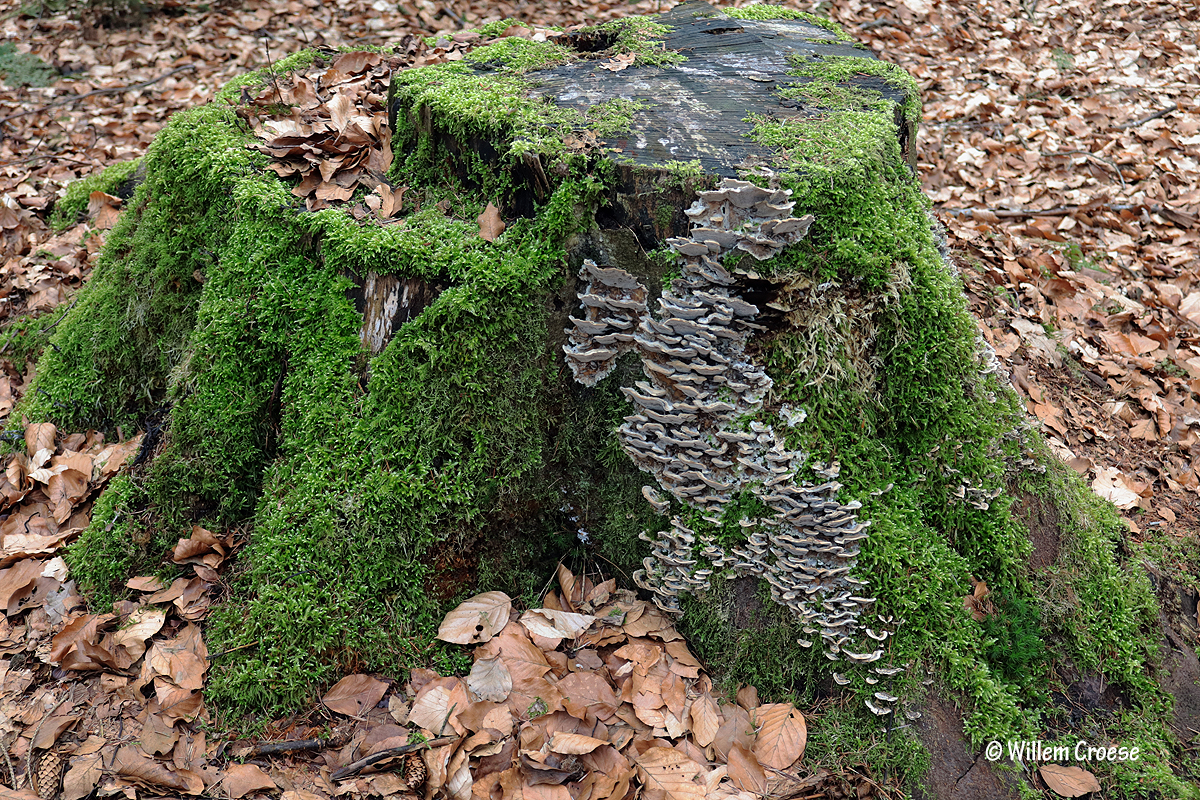 07. Grijze zwammetjes in het groen op een boomstronk …