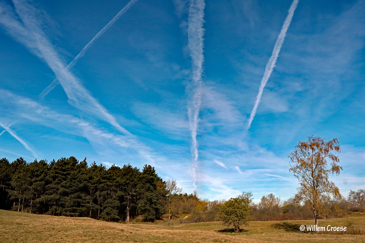 01. Een zonnige ochtend met ook strakblauwe lucht al zijn er nogal wat strepen te zien oftewel sporen van vliegtuigen …